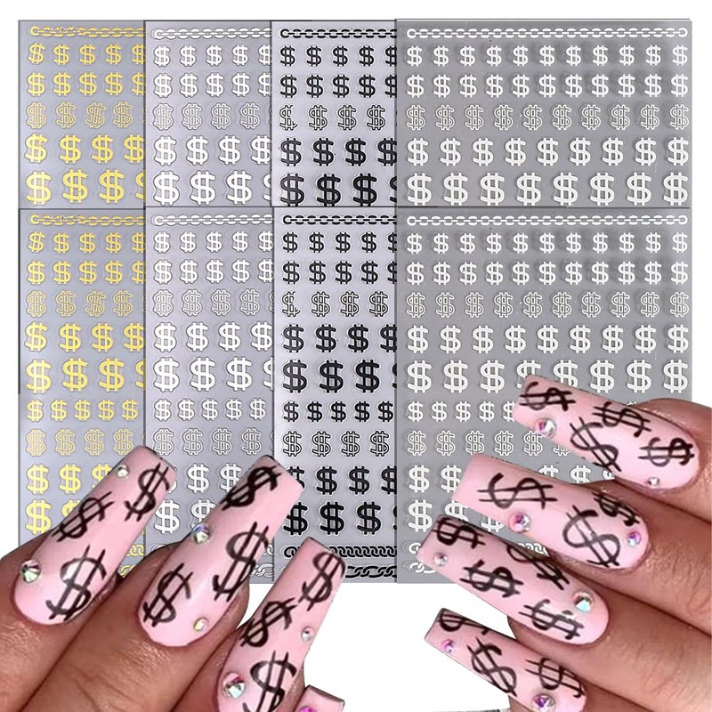 - Multiple Choices - Come with 8 sheets dollar sign nail stickers. It contains 4 colors, gold, silver black and white, 2 sheet for each. A large number of different patterns for you to use and change in your daily life, and various patterns bring you a different mood.