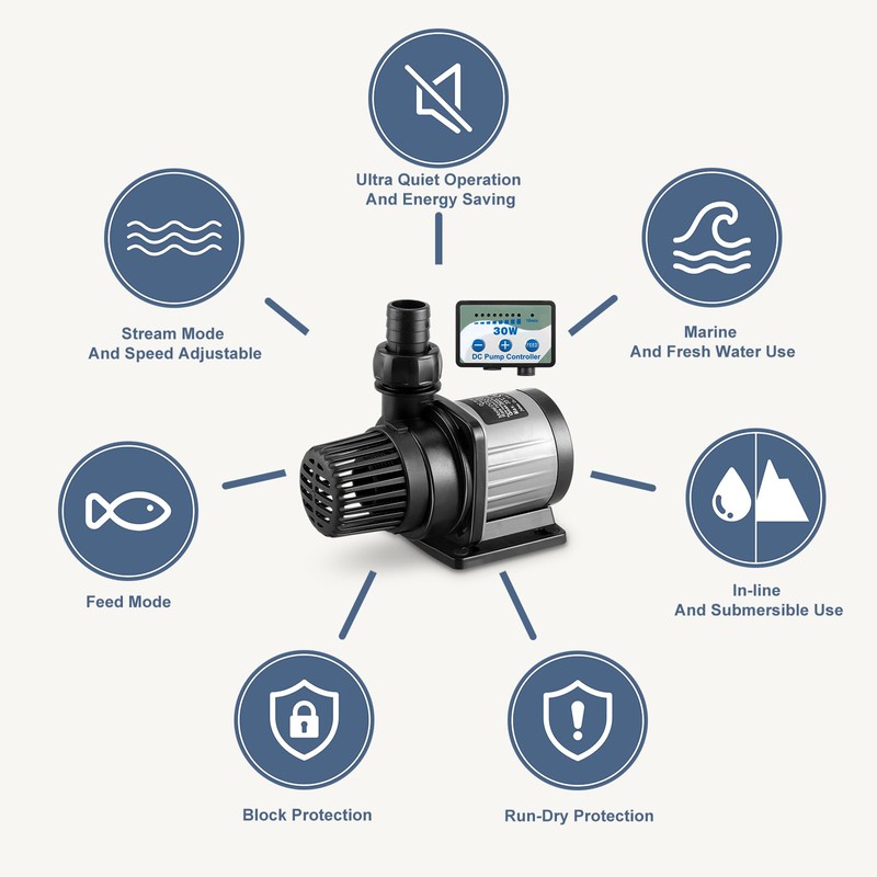 - 8 speeds adjustable DC24V fish tank pump,with 10minutes FEED Mode,Automatic power-off protection upon no water or impeller blocked;