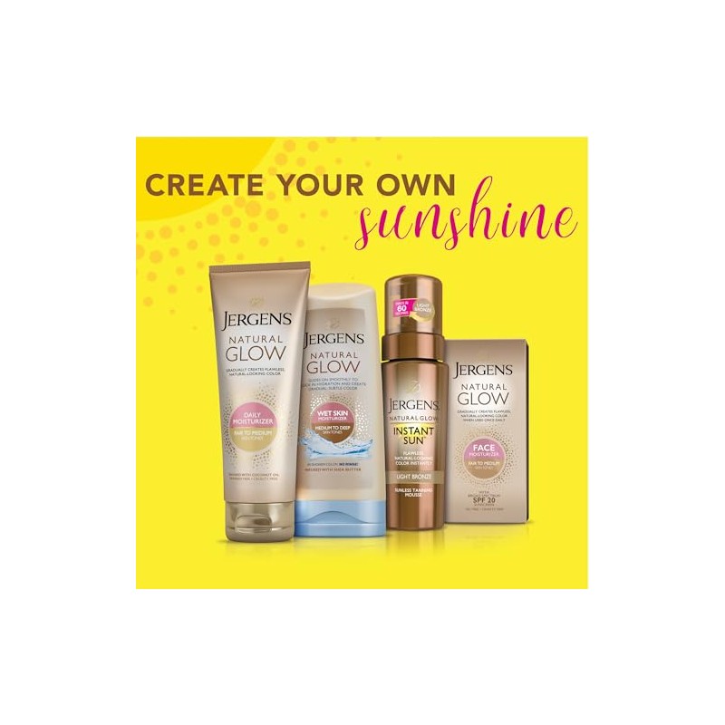 Jergens Instant Sun brings on the sunshine whenever you’re ready to glow. No swimsuit or sand required! If you want deeply sunkissed, flawless skin without exposing your skin to harmful UV rays, meet Jergens Instant Sun Light Bronze sunless tanning mousse, your beach in a bottle. This self tanner is formulated to work with your unique skin tone to deliver flawless natural-looking color that mimics beautiful color from the sun without the unpleasant sunless tanner odor. The natural, sun-free glow will make you never want to get a spray tan again! This tanning foam formula with our Advance Color Complex dispenses into an airy mousse that spreads evenly for a flawless tan that dries in just 60 seconds. The flawless tan gradually deeps to an elegant, award-winning bronze glow within a few short hours. Jergens Instant Sun can help even out your overall skin tone for a more polished look from head to toe. And this tanning mousse is not just for women. It’s the perfect way to get a glow for all. Looking for a man tan? Jergens Natural Glow Instant Sun Light Bronze will have you glowing in no time. Jergens Natural Glow Instant Sun Light Bronze offers safe, hassle-free color, even when the beach is miles (or months) away. Simply apply using our Instant Sun sunless tanning mitt, included. The mousse is tinted for precise applications. It delivers stunning, streak-free results. Jergens Instant Sun allows you to get the perfect tan every time. If you want an even deeper color, you can use this tanning foam again the following day. In the winter months, Jergens Natural Glow Instant Sun Light Bronze will give you that “just back from a 5-star resort” glow. This formula is infused with coconut water and has a tanning active derived from natural sugars. It delivers stunning, streak-free results with a formula that is Paraben Free, Cruelty Free, and Dermatologist Tested.