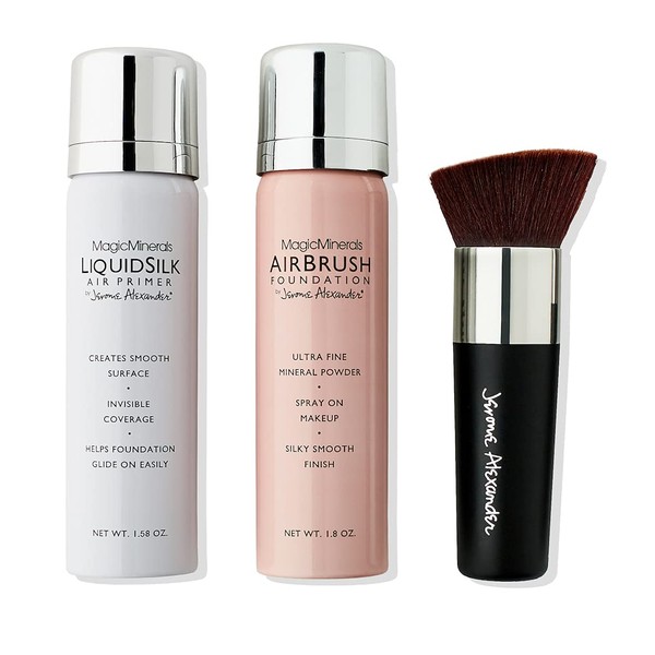 - BUILDABLE, BREATHABLE, LIGHTWEIGHT COVERAGE FOR ALL SKIN TYPES: Our innovative spray foundation provides full coverage in an ultra-light mineral formula. Light enough for everyday use, this buildable foundation makeup conceals hard-to-cover areas and gives you a soft, matte finish without caking, creasing, streaking, or causing excessive oil build-up. - PERFECT PREPARATION: Includes LiquidSilk Air Primer which smooths skin and diminishes the appearance of pores plus hydrating. - EASY APPLICATION FOR ALL SKIN TYPES: Includes the Kabuki Brush which allows for blending. -STUNNING RESULTS EVERY TIME: MagicMinerals AirBrush Foundation by Jerome Alexander provides rich, mineral airbrush foundation coverage that’s perfect for women of all ages!