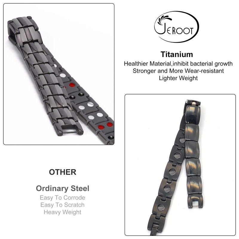 - 4 elements in one titanium power bracelet: titanium is undoubtedly the best metal for everyday use, it is healthier, does not irritate the skin, compared to stainless steel, it is lighter, harder and more wear-resistant. 3500 gauss on each magnet and 44 magnets (silver magnet, black germanium, red far infrared radiation, white-negative ion) 4 elements in one bracelet. Get a better effect of magnetic field therapy