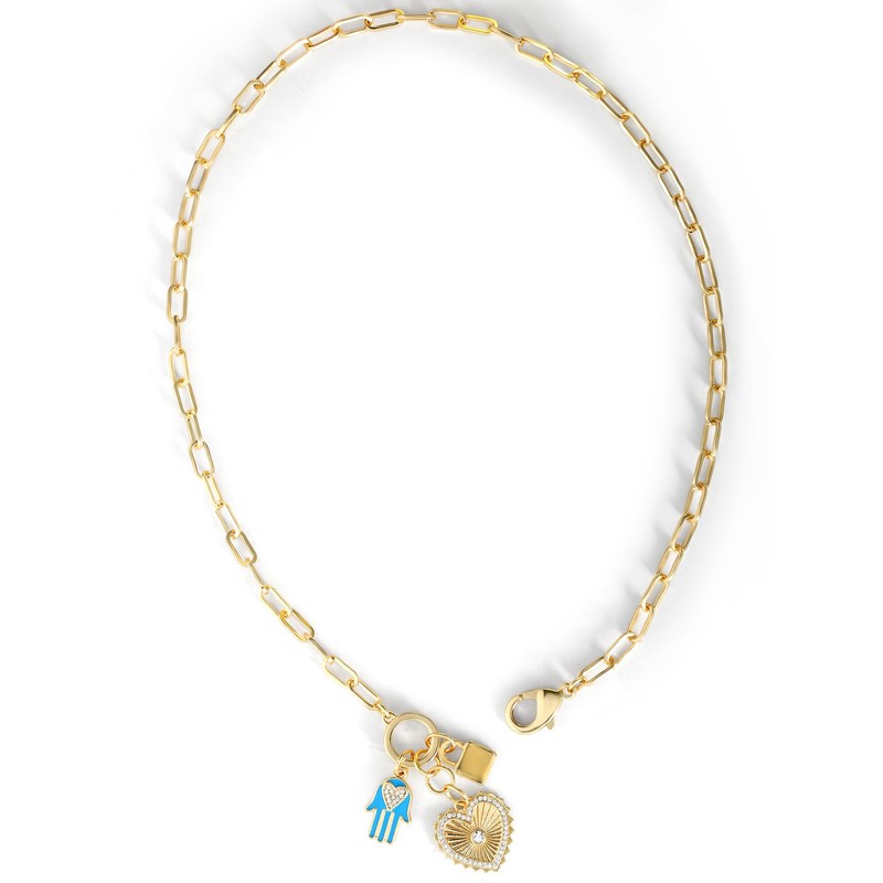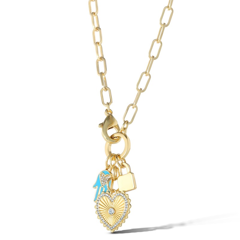 - Loving Jewelry: Triple charm necklace is lovingly embellished with a padlock charm, heart charm with clear rhinestone embellishments, and a turquoise enamel-plated charm with a rhinestone heart center for an enchanted look.