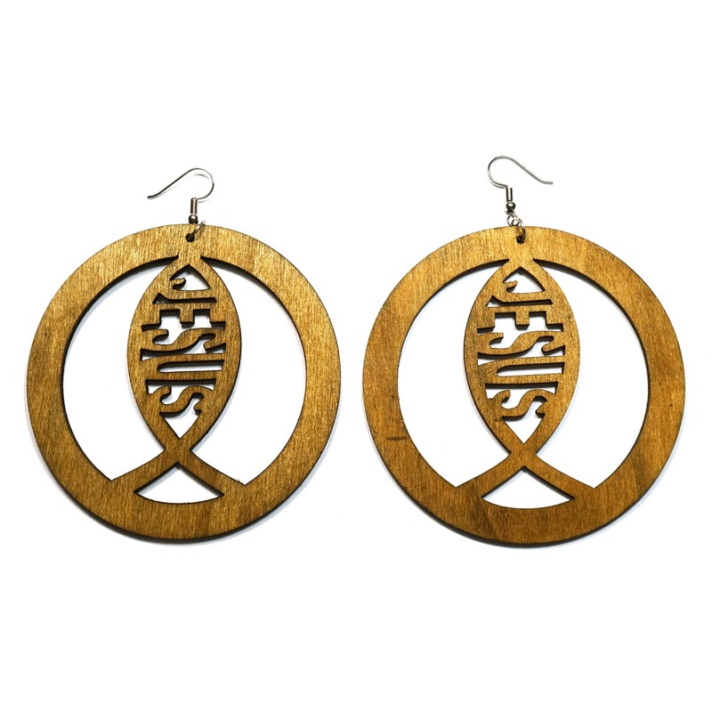 Jesus Fish Symbol Spiritual Ichthus Wood Engraved Big Circle Round Women Dangle Drop Fashion Earrings (Brown)