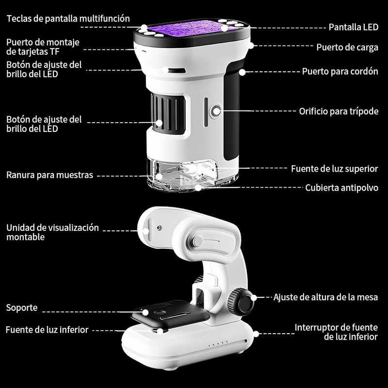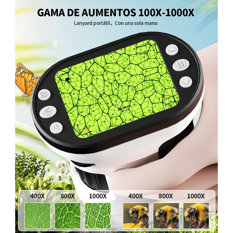 • 【3 en 1 Microscopio portátil】Microscopio de Bolsillo puede ver objetos en el rango de 5- 200x con zoom digital 5x.Resolución de vídeo 1080 FHD.6 iluminador LED ajustable asegura que sus especímenes son claros y brillantes. Además, soporta ajuste multilingüe para una fácil visualización de hojas, insectos, flores y otros mundos microscópicos.
