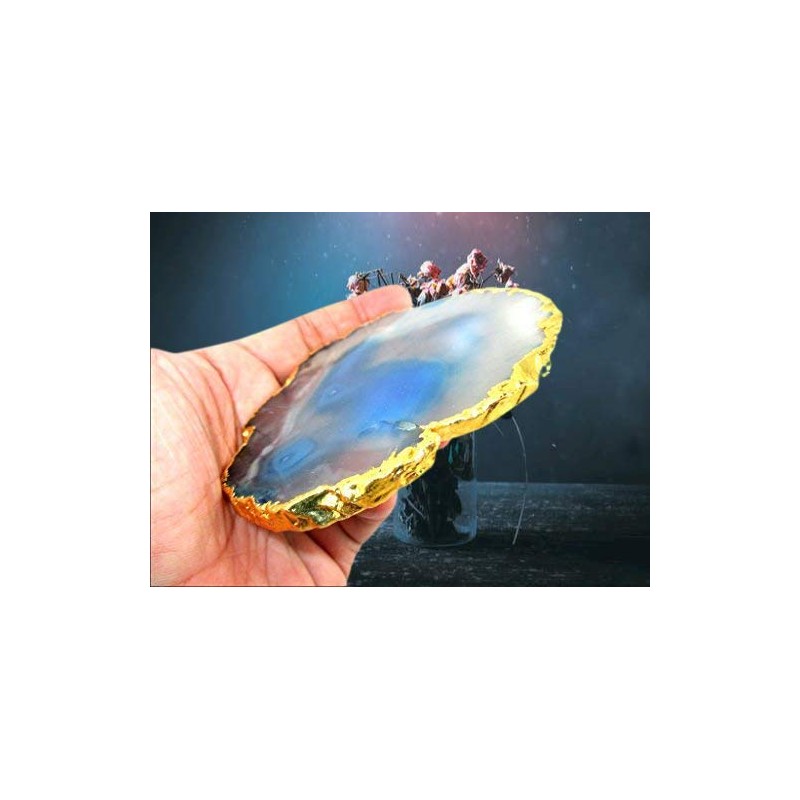 - Jet Blue Gold Plated Agate Slice Single (1) 4 inch approx. Gemstone Coaster Saucer Geode Stone Cup Holder Table Decoration Home Jet International Healing Crystal Therapy Booklet Metaphysical w/ Pouch Sacred Geometry Good Luck Stone Divine Prosperity. One of our best made products and loved globally by our beautiful customers. Totally Handcrafted & Carved product so each product varies in terms of color, shape, size, looks however the Healing Qualities & Metaphysical Properties are EXCELLENT.