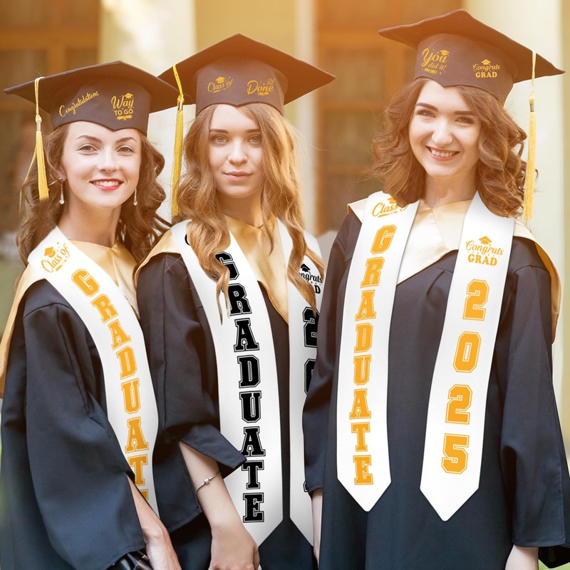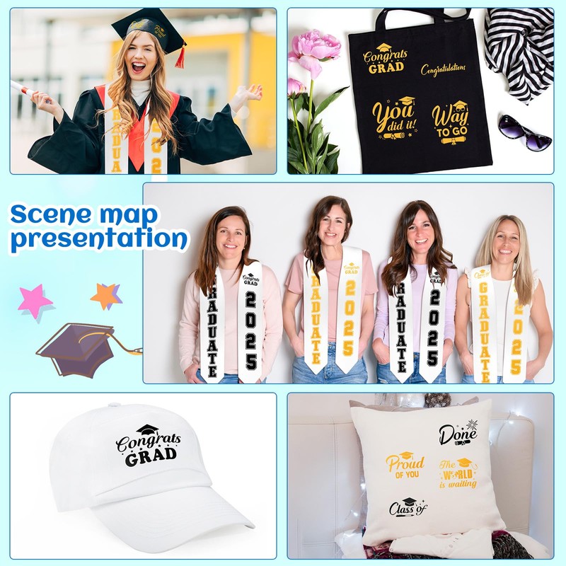 - Adequate Quantity: you will receive 4 pieces graduation stoles and 8 sheets iron on decals in total; Iron on decals include 4 sheets"GRADUATE 2025", 2 sheets iron on inspirational words and 2 sheets iron on letters A-Z with numbers 0-9; Enough plain graduation stoles and iron on decals can support your crafting DIY, replacement needs, or gifts needs to your classmates