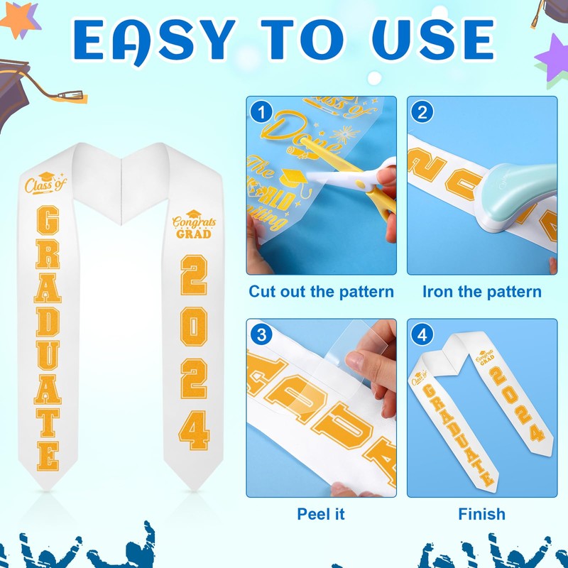 - Easy to Apply: firstly you need to cut out the decals you want and preheat the iron; Then place the letters or numbers decals on graduation stole, bachelor cap or clothes to keep it in place; Finally Iron the patch directly with pressure for about 30 to 60 seconds to ensure that the adhesive heats up and adheres to the fabric; You will get an impressive custom graduation stole of class 2025