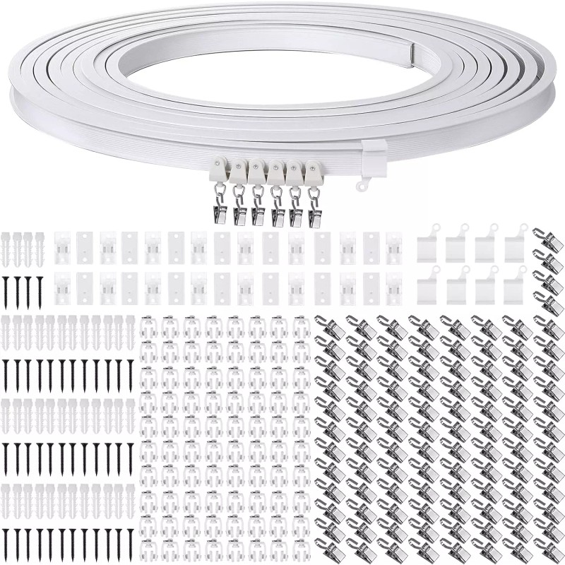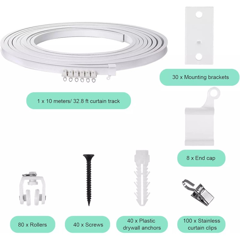 - Package includes: come with 1 piece of 3 meters/ 9.8 ft curtain track, 24 pieces of rollers, 9 pieces of mounting brackets, 12 pieces of screws, 12 pieces of plastic drywall anchors, 2 pieces of end cap and 30 pieces of curtain clips, enough for most situation