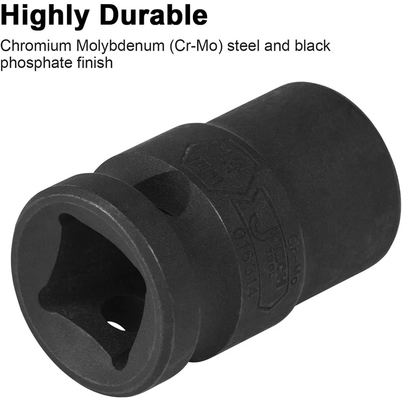 - Cr-Mo ALLOY STEEL - Cr-Mo impact socket features with added strength, higher working temperatures and corrosion resistance. It's much stronger to stand greater impact force than chrome vanadium ones.