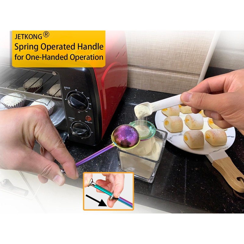 - STURDY AND WELL MADE - JETKONG sugar shaker duster is made of stiff food grade 304 stainless steel, the spring-operated handle and the round sifters welded together and rust-proof.