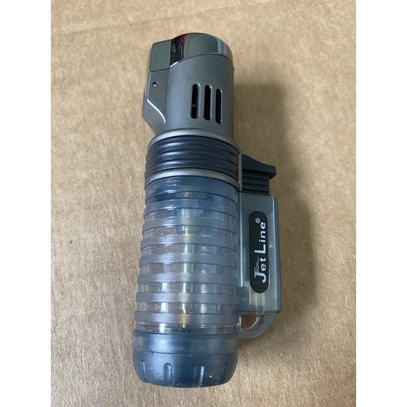 The Jetline pocket torch has a large fuel tank and translucent body for easy fuel viewing.  Features two jet flames and flame adjustment dial.  The lighter is 3 1/2 inches tall and 1 1/2 inches wide at the widest point.