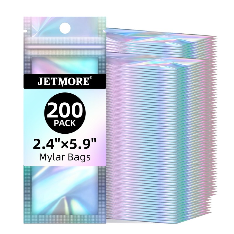 JETMORE 200 Pcs Holographic Bags, Mylar Resealable Bags, 2.4x5.9" Smell Proof Bags, Foil Pouch Sample Freshie Packaging Bags for Small Business Jewelry, Candy, Party Favor, Gift, Food Storage