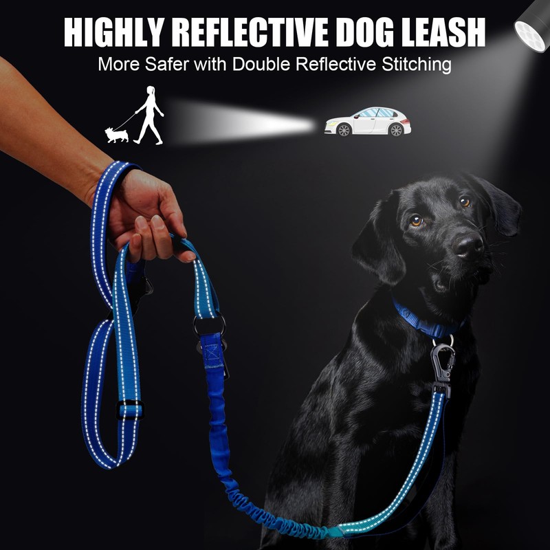 - NIGHT SAFETY WITH DUAL REFLECTIVE STRIPS — Upgraded dog bungee leash includes Dual Reflective Stitching across all of the Entire Dog Leash to provide maximum visibility, both you and your dogs can be safely seen in the darkness, offer you better safety while walking at night, early morning or rainy days