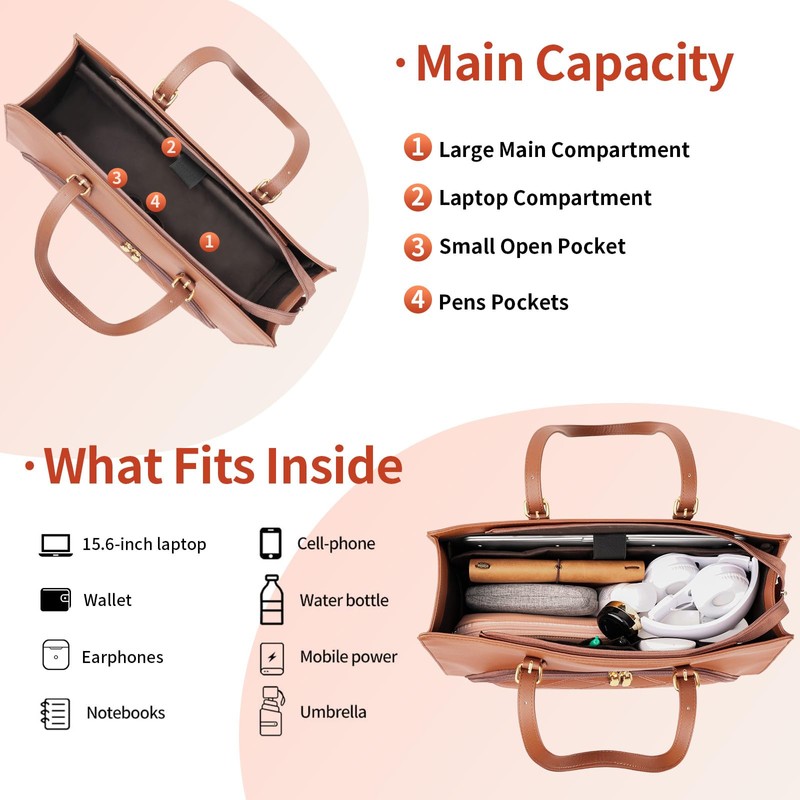 - Versatility 15.6'' Laptop Bag: This leather tote bag with its size of 17.1" x 6.3" x 12.2"(L*W*H), presents ample space complemented by multiple compartments. The upper area of the cooler compartment can hold your laptop, charger, notebook and stationery. Specifically designed for the busy professional ladies, the laptop briefcase keeps everything organized and easily accessible. The adjustable handle spans a length from 8.6 to 11.8 inches, and the shoulder strap is from 28 to 49 inches.
