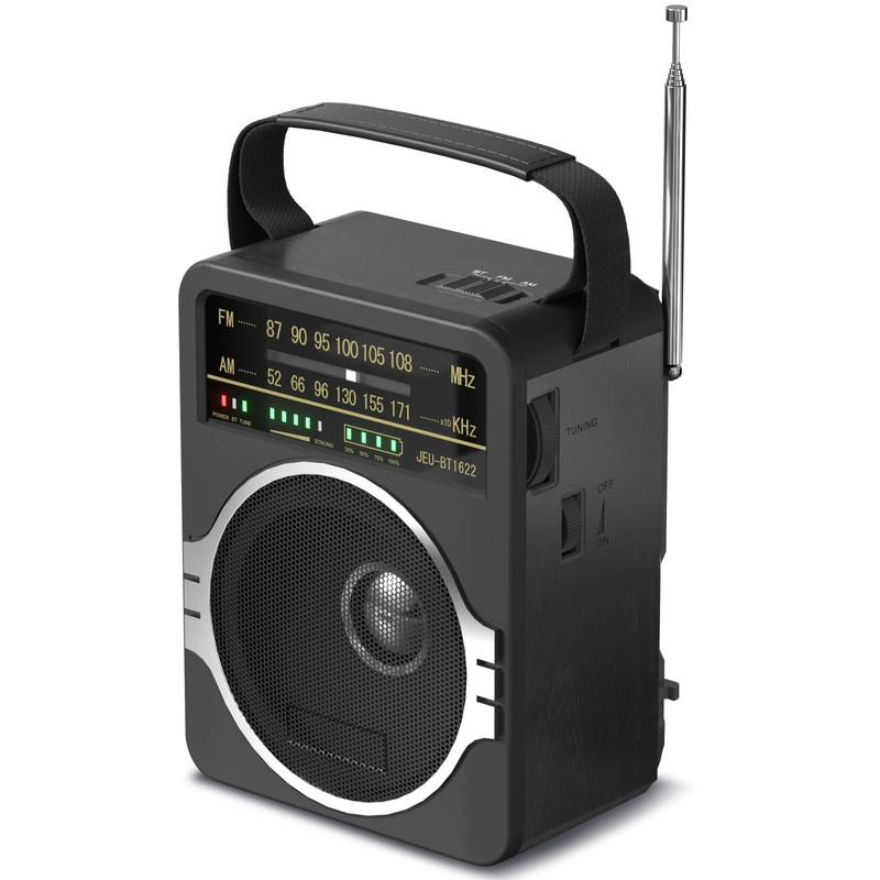 JEUJUG Portable AM FM Radio, Bluetooth 5.0 Radios 5 Watts Loud Speaker,FM Radio Built-in Rechargeable Battery/DC D*4 Cell Battery Operated & AC Power Plug in Wall Black