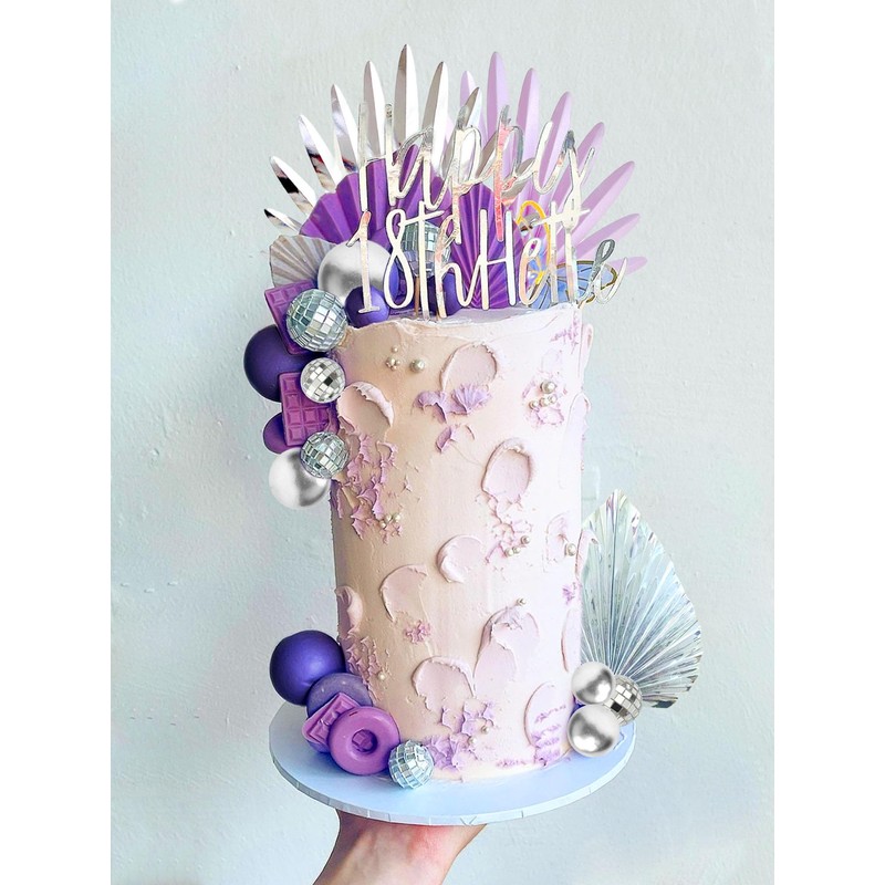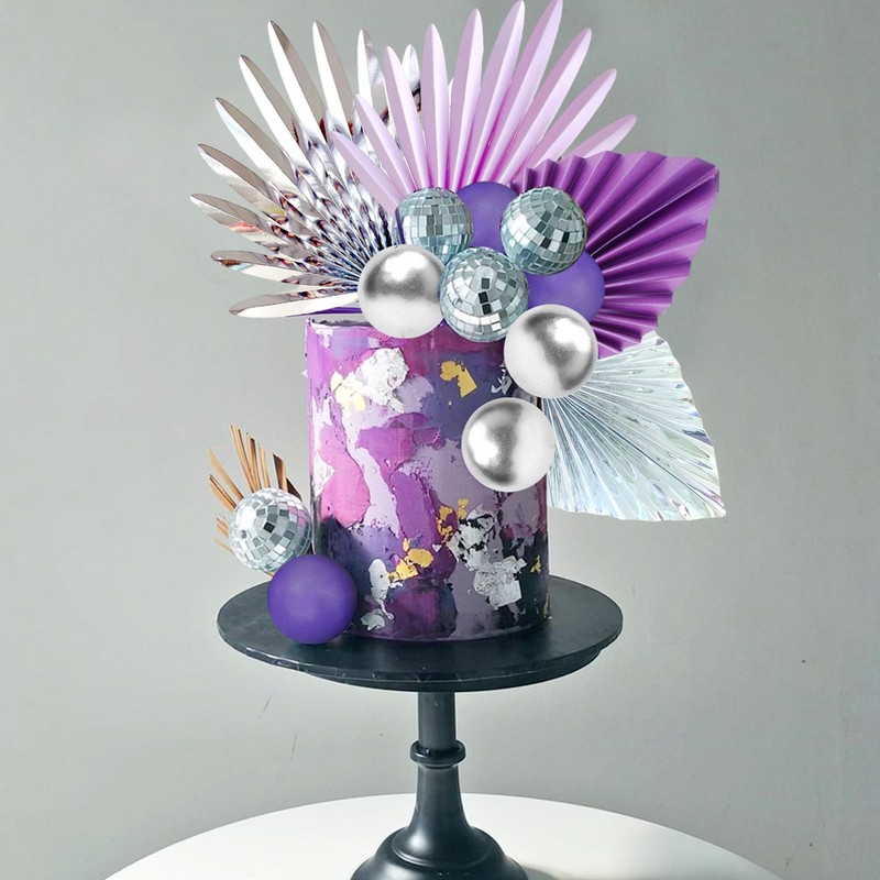 JeVenis - Bolas de discoteca moradas para decoración de pasteles, hojas de palma plateadas, decoración de pasteles, decoración de tartas de los años 70, suministros de fiesta de cumpleaños de los años