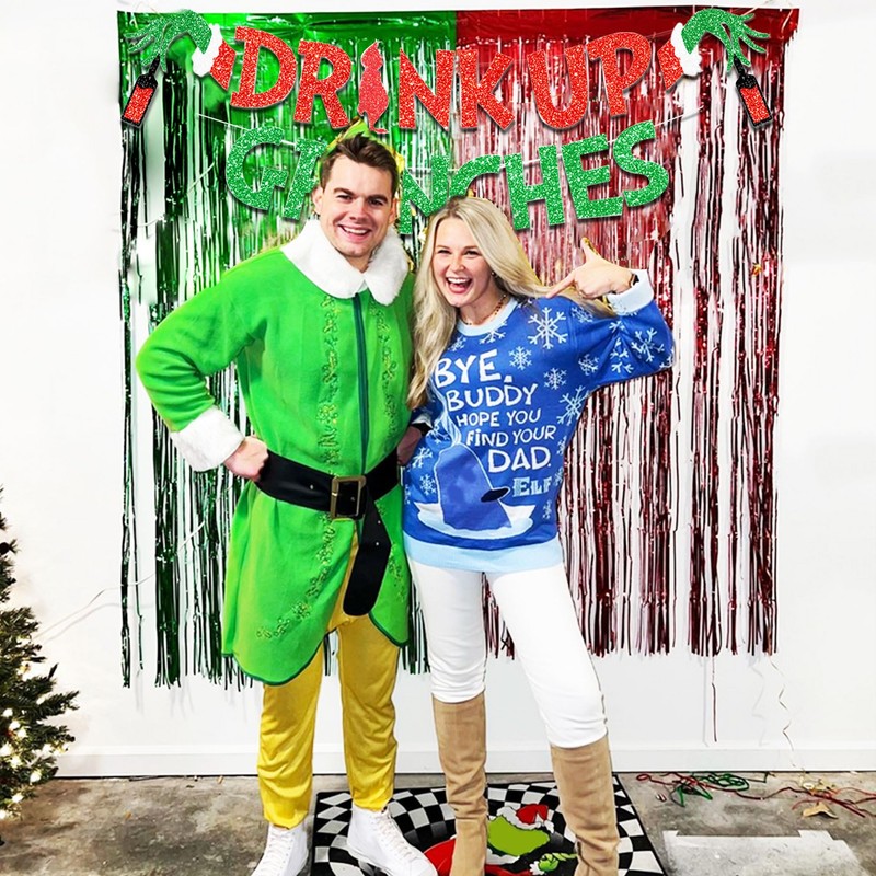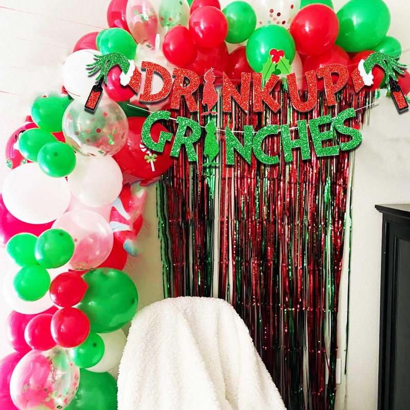 - You will get: 1x ‘DRINK UP Grinchmas’ banner, 1x green curtains, 1x red curtains