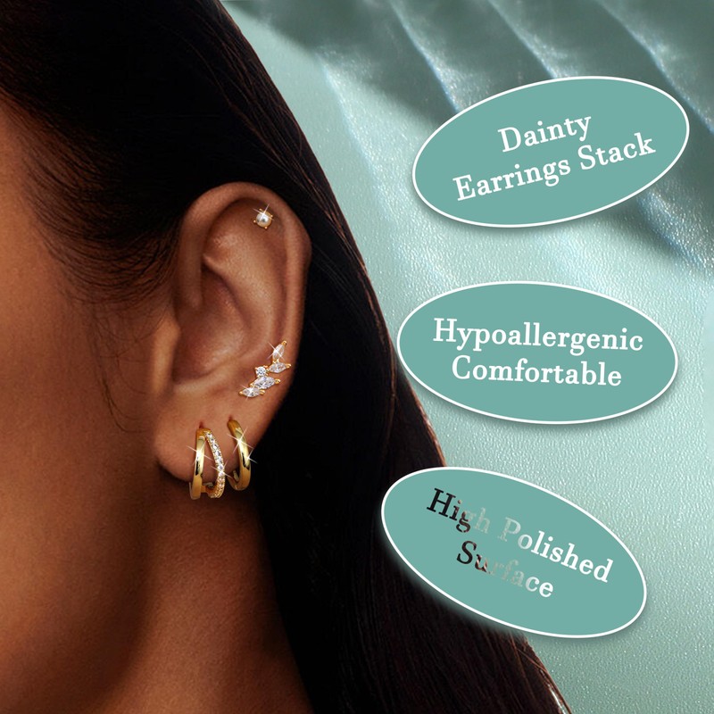 • Hypoallergenic Earring Sets for Multiple Piercings--These exquisite women's earring sets are made of 14K gold-plated brass and 316L surgical steel, which are nickel-free and lead-free, hypoallergenic and friendly to sensitive skin. The outer surface is electroplated with white gold/14K gold, and the thick plating layer ensures durability and is not easy to fade. Inlaid with 5A+ shiny cubic zirconia, not easy to fall off.