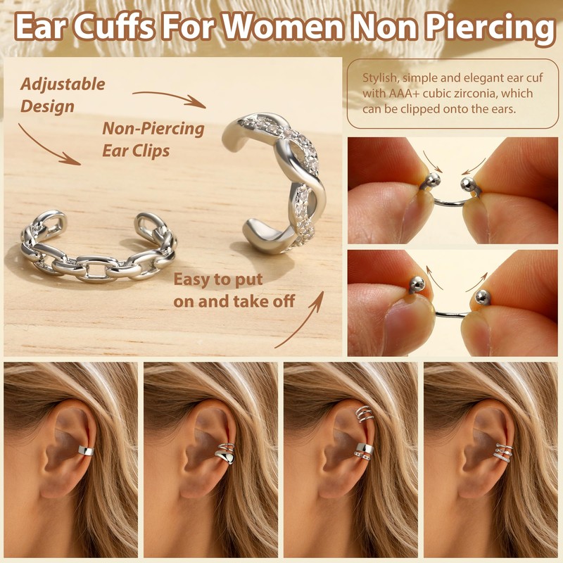 - Ear Cuff No Piercing:These silver/gold ear cuff are lightweight and comfortable, perfect for wearing alone or stacking with other clip on wrap earrings sets. The surface of the ear cuff no piercing is smooth, and they will add a unique sparkle to your look whether for everyday wear or special occasions. With a classic and versatile style,clip on earrings are adorned with 5A+ cubic zirconia, making your daily outfits stylish and bright.