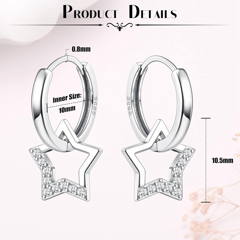 - Cute earrings for girls size: inner diameter of the hoop earrings: 10 mm, size of the stud earrings: 20G = 0.8 mm, length of the pendant star: 10.5 mm. The star pendant can be removed, so you can wear the hoop earrings alone or stack other earrings. A pair of 925 silver hanging earrings can be worn in many ways to meet your different needs