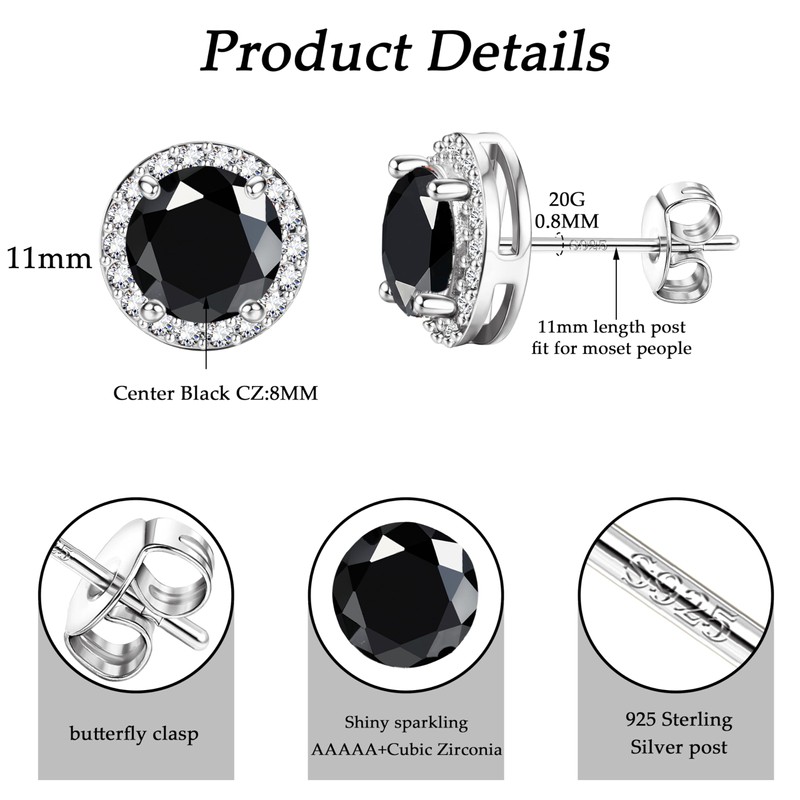 - Women's 925 silver earrings: these cubic zirconia stud earrings have a 20G (0.8 mm) thick post with a length of 11 mm. The inner round CZ measures 8mm in diameter, with a total earring diameter of 11mm. These elegant sterling silver stud earrings are perfect for parties, weddings, proms, shopping, work and other special occasions