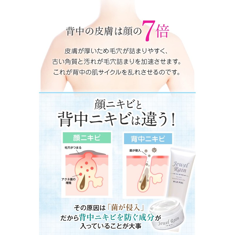 - Penetrating and Moisturizing Force: Medicated jewel rain AC body gel can be applied to the decollete. Approach to acne by improving penetration (*) and moisturizing Jewel Rain Mild Peel is a gentle and mild peeling that will guide your back to a smooth condition and eliminate crushed old exfoliatin. In particular, men are prone to acne on their back, so it is necessary to take care of your back from regular time. Also makes a great back care gift