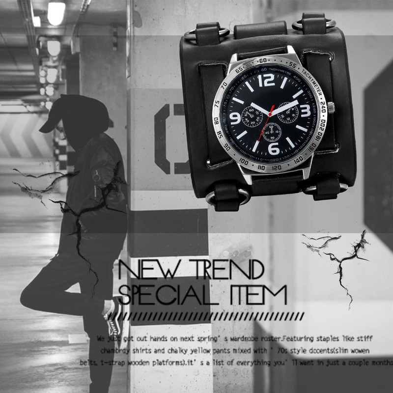• DELICATE DESIGN: The punk watch is bigger than normal. Big watch for big man. To be a cool men winning compliments with the stylish watch. Black dial with silver hands and time mark, simple and classic. With 3 non-functional small sub-dials, the watch is more charming. Unique watch band design, stylish and comfortable.