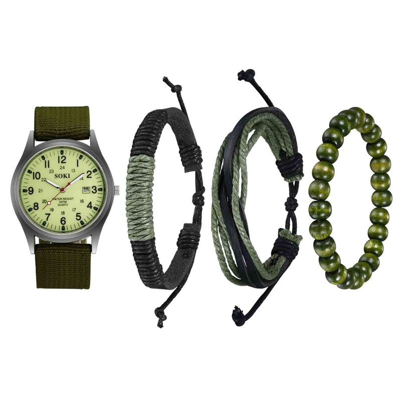- HIGH QUALITY: Soft and breathable nylon strap. wood bead and leather bracelets. Metal buckle for adjusting band size from 16cm to 20cm to fit different size of wrists. PU leather on nylon strap is more durable. Metal watch case is durable. Metal back for daily waterproof. Green metal dial is eye-protecting and for clear time display.