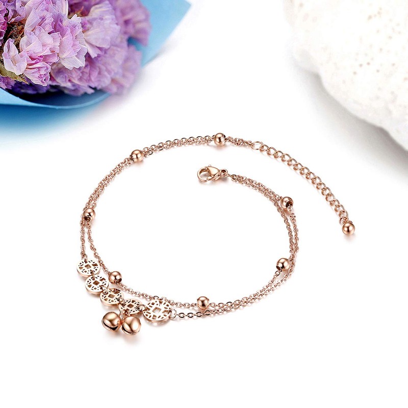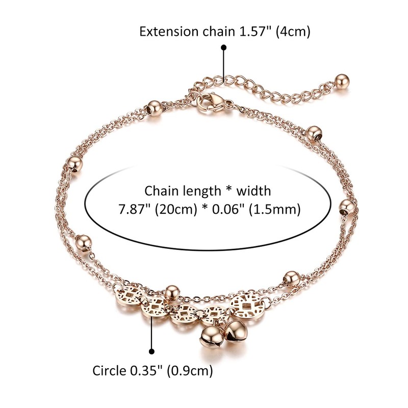 - ♥ Women's bracelet – This bracelet consists of 2 small chains with 5 Chinese coins, 2 bells and some beads in rose gold. This piece of jewellery can be used not only as a women's bracelet, but also as an anklet for girls. The unique shape attracts everyone's attention