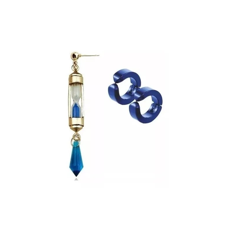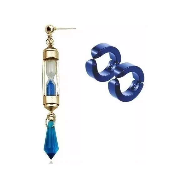 Incluye 1 Arete de reloj con piedra tipo acrilico y 2 aretes de argolla azules en aleación de zinc.