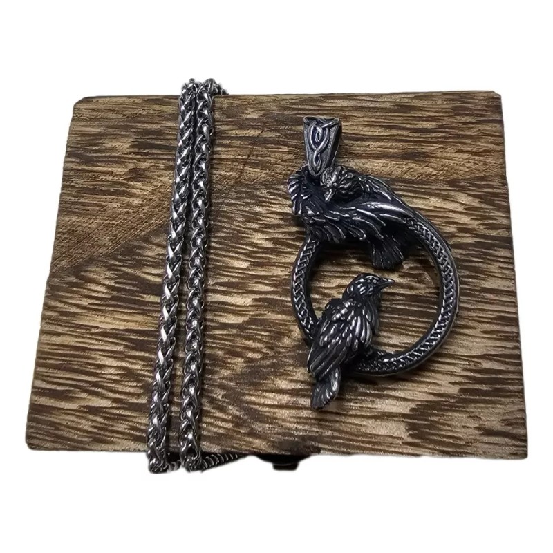 Collar de Acero de inoxidable de cuervos nordicos + caja de madera y bolsa de regalo.
