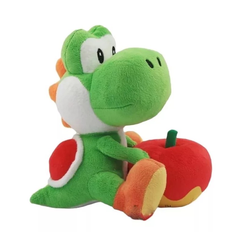 Peluche de Yoshi con Manzana de la saga de Mario Bros para niños, ideal para regalo, les será una sorpresa esta tieno peluche en Felpa y Algodón con altura de 17 cms.