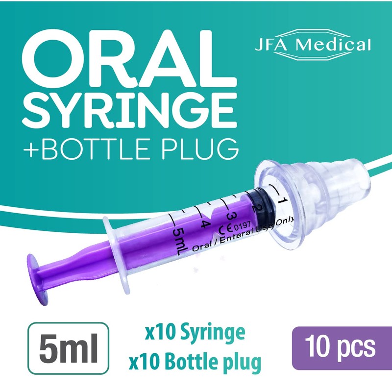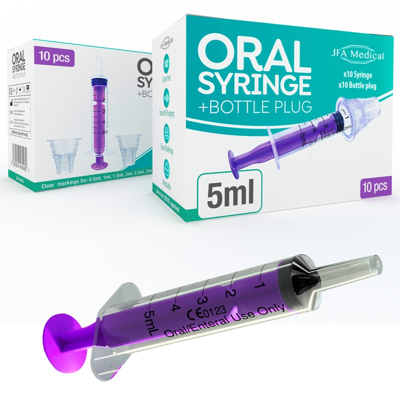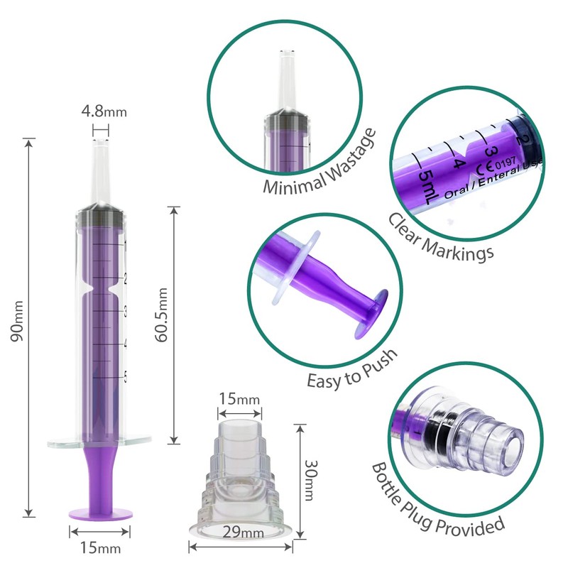 - Pack Contents, 10x 5ml Oral Enteral Syringe, 10x Bottle Plug