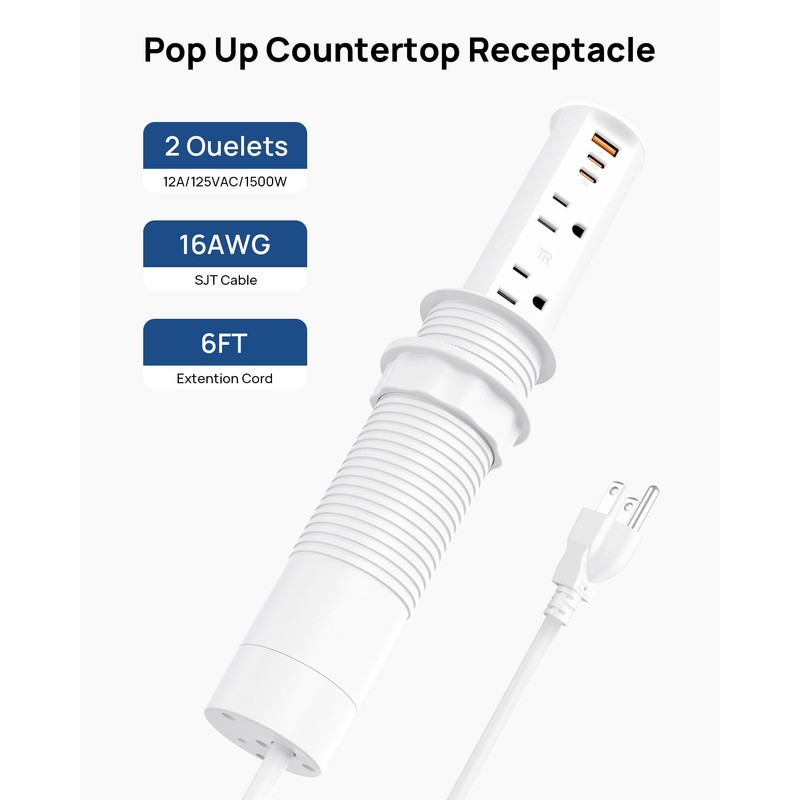 - Water-Resistant and Durable: Crafted with refined hardened scratch-resistant PVC plastic, this splash-resistant pop-up countertop receptacle is built to last. Accidental spills can be easily wiped away, allowing the outlet to continue functioning normally. It's the perfect blend of durability and convenience for any kitchen countertop or office space.