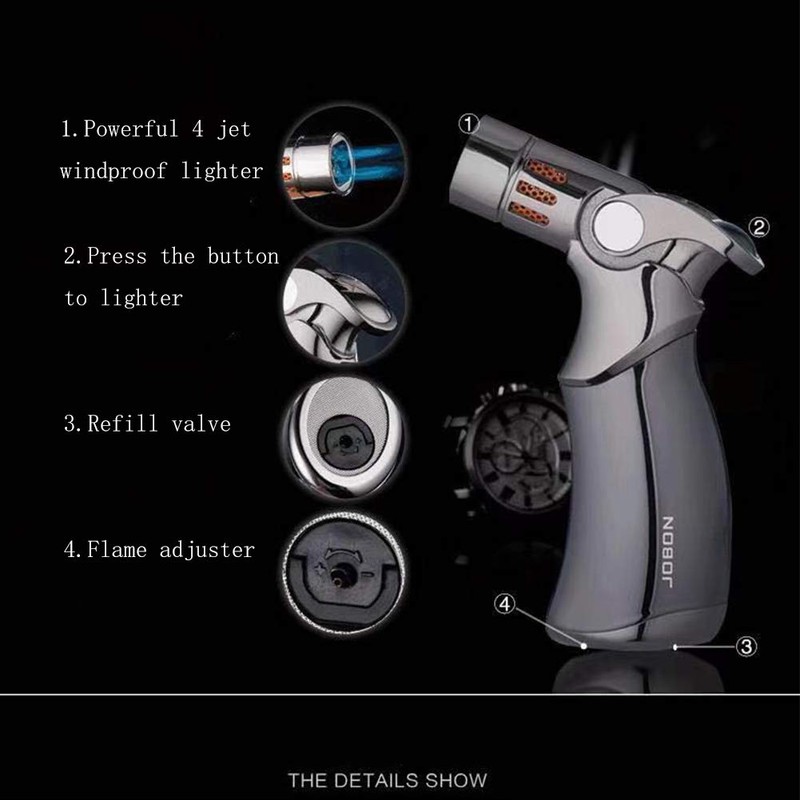 JH& Torch Lighter Quad 4 Jet Flame Refillable Butane Cigar Lighters Adjustable Windproof Lighter Butane NOT Included Black