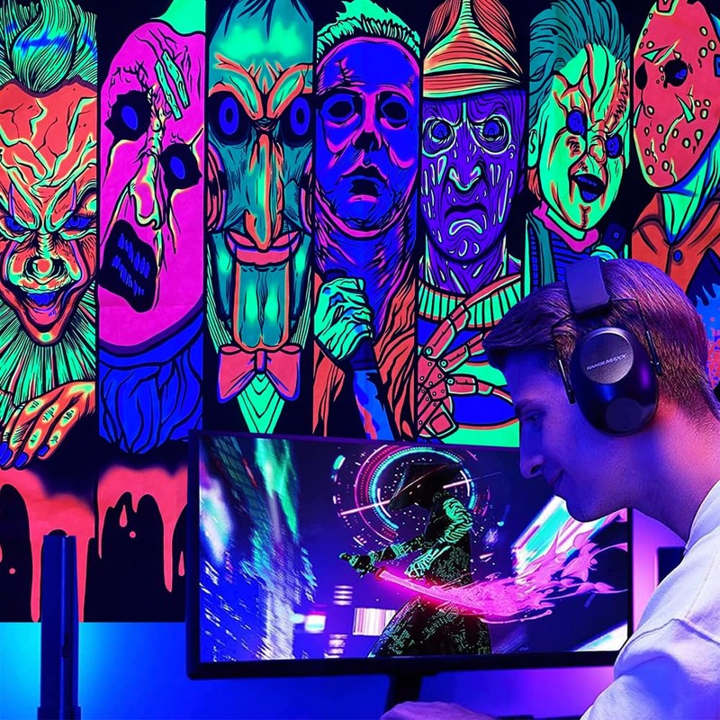 - Scene Decoration: blacklight horror tapestry can be used to decorate your bedroom headboard, living room, sofa background, and can be framed to create wall art, window curtains, closet separators, and ceiling wall decor. It is also perfect as a party backdrop.