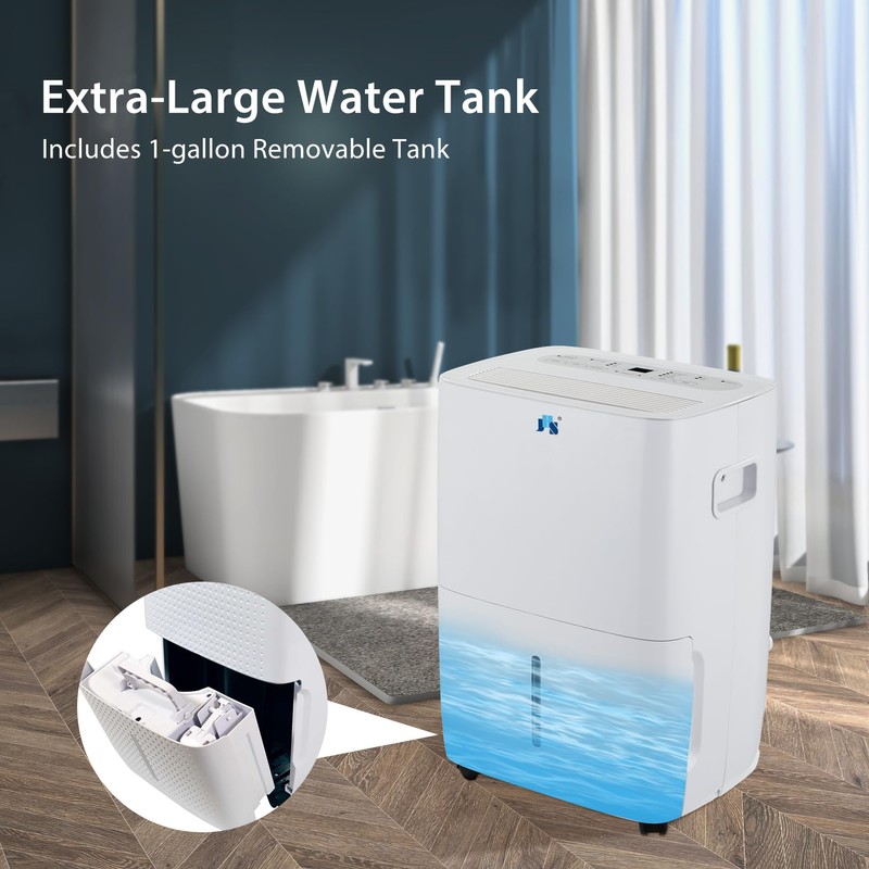 - Efficient Moisture Removal: The JHS dehumidifier efficiently removes up to 25 pints of moisture daily, maintaining optimal humidity levels (35% to 80% RH) in spaces up to 1,500 sq ft. Perfect for basements, large rooms, and bathrooms.