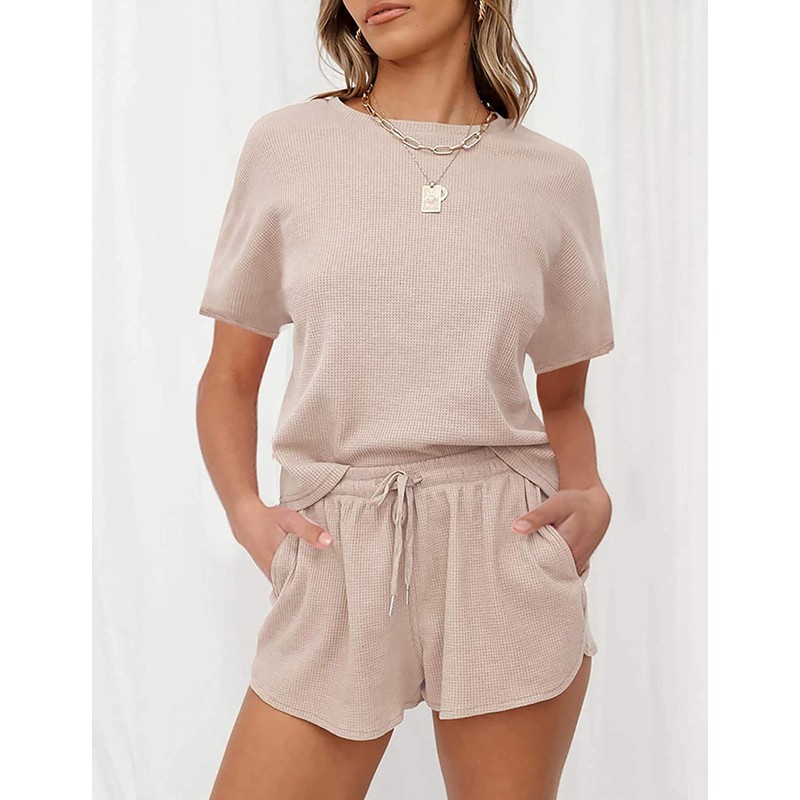 Jhsnjnr Women's Waffle Knit Pyjamas Short Sleeve Top and Shorts 2 Piece Lounge Sets with Pockets