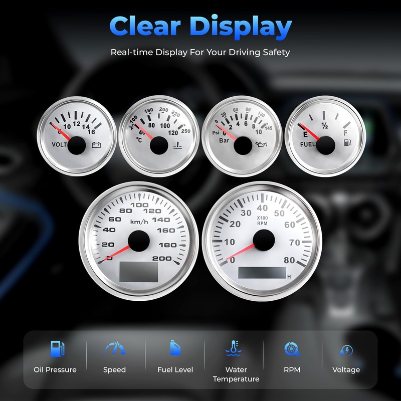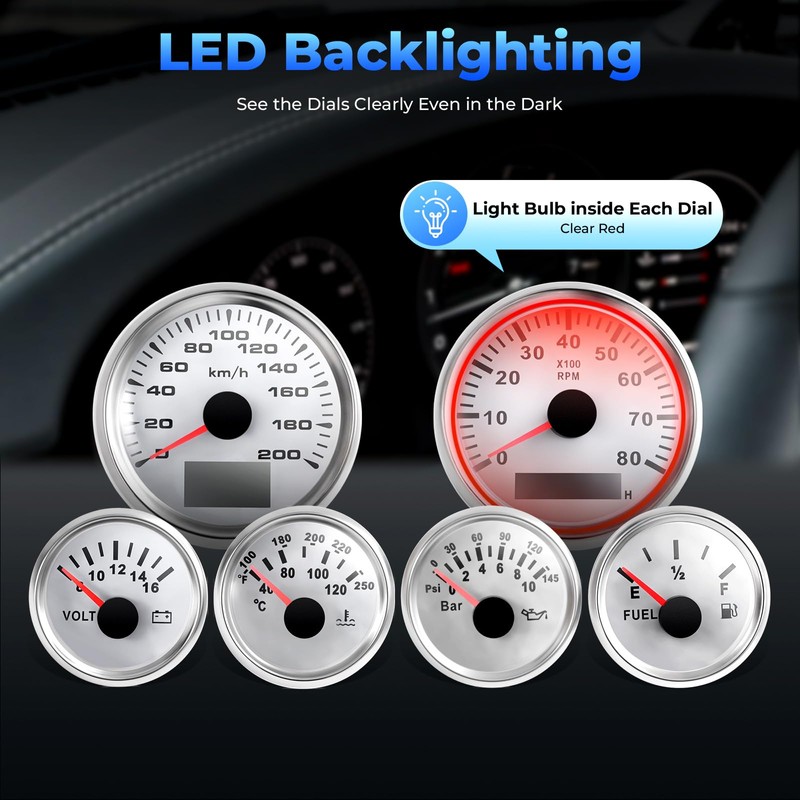 - 【UNIVERSAL COMPATIBILITY & EASY INSTALLATION】:Works with 9–32V DC power. Tachometer supports ECU/coil signal input; fuel/oil/water gauges include sensors and fittings (1/8NPT). Comes with wiring harnesses, brackets, and manuals.