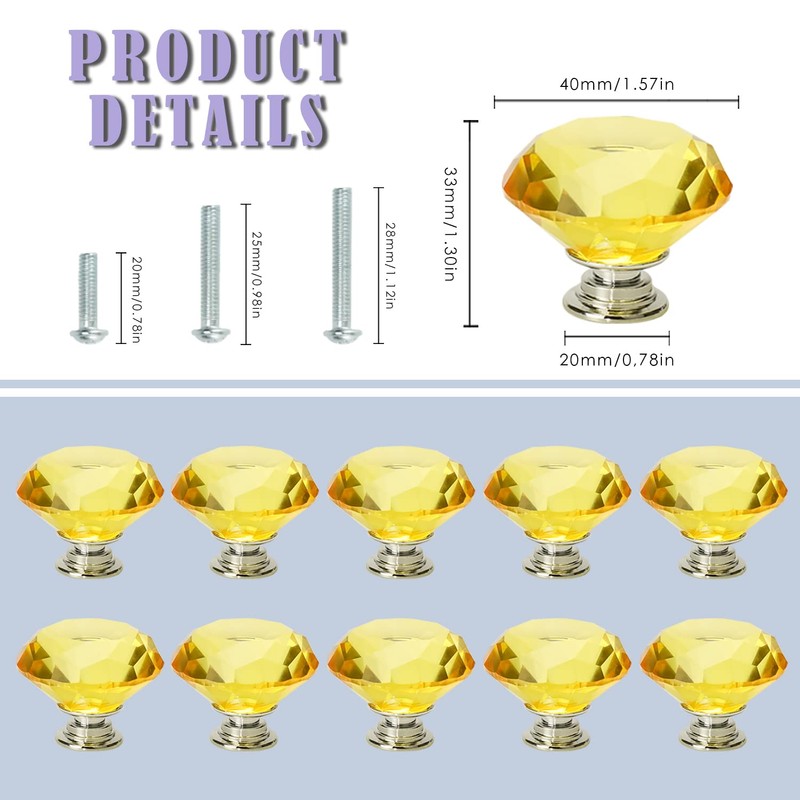 - PRODUCT INCLUDE:10pcs 40mm Diamond-Shaped crystal glass knobs and mounting screws of 3 different lengths and enough metal gaskets are available to make the knobs suitable for any kind of wardrobe.