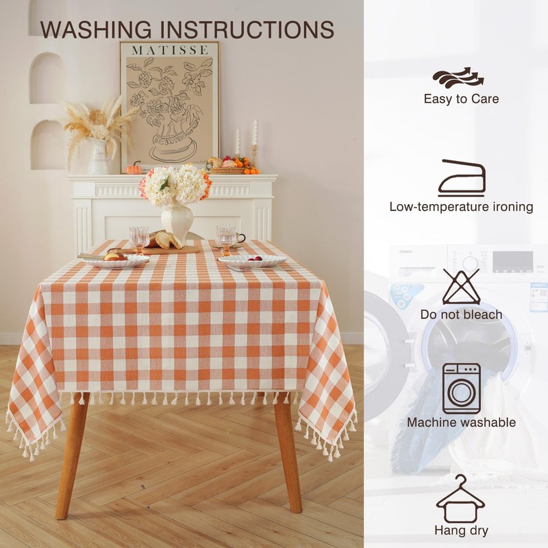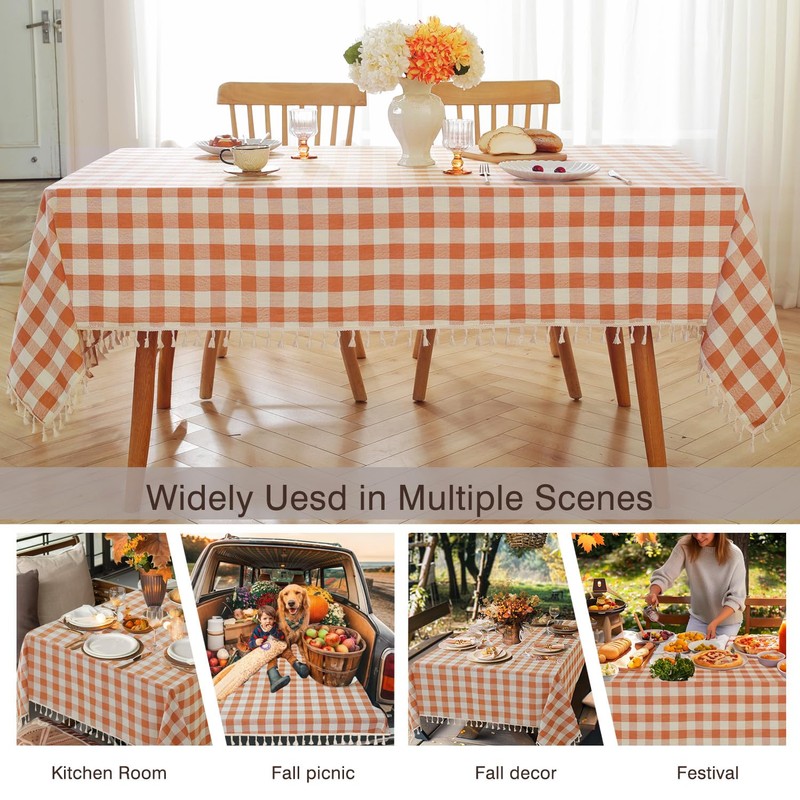 - Plaid Pattern Design: Classic fall orange and white buffalo plaid tablecloth, suitable for rustic or modern decorating style, creating a relaxing and pleasant dining atmosphere.