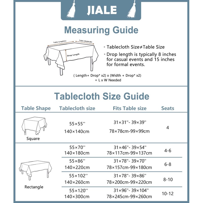 • 【Materials and Benefits】JIALE tablecloths are made of new upgraded high-quality heavy-weight cotton linen fabrics, non-slip and wrinkle-free, not easy to scratch. Match with the additional waterproof coating process. Make the tablecloth splash-proof, waterproof and stain-proof. While better protecting your dining table, it also has a good dropping effect.
