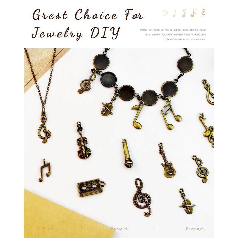 - Color: bronce antiguo. Versátil suministro de joyería para arete, collares, pulseras, cinturones y decoración del hogar. Te da la sensación de antiguo. Tiene muchos tipos, como guitarra aguda, trompeta, cinta de casete, saxofón, micrófono, etc