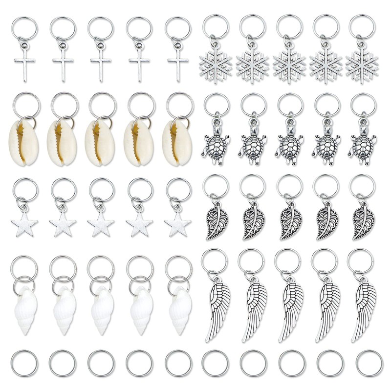 JIALEEY Hair Braid Rings, 50PCS Hair Loops Clips Silver Ring Shell Leaves Star Conch Snowflake Pendant Charms Set Hair Clip Headband Accessories