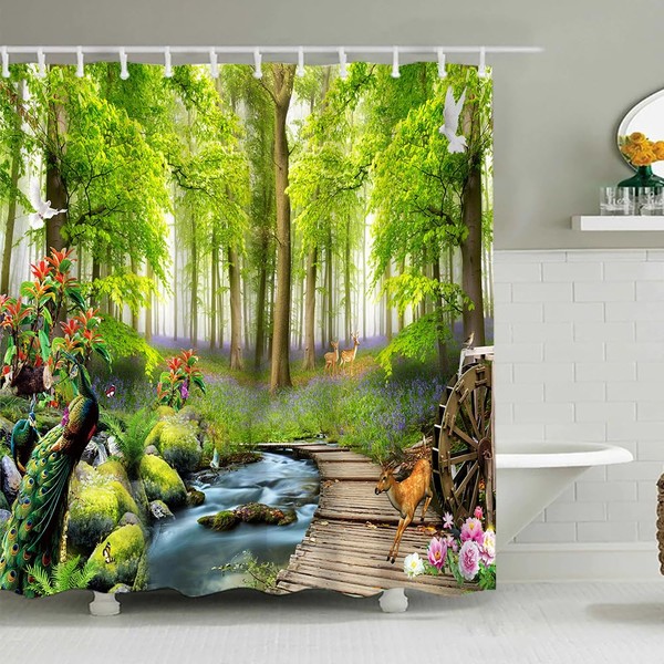 - SHOWER CURTAIN - Green forest shower curtain for bathroom, super soft and quick dry fabric bathroom curtain set with hooks, the scenery shower curtain adopts advanced digital printing technology, which means that the shower curtain is not only clearer and more beautiful in pattern, but also will not fade during the cleaning process. This is a low-cost bathroom accessory that can change your bathroom image and bring a relaxing shower time.