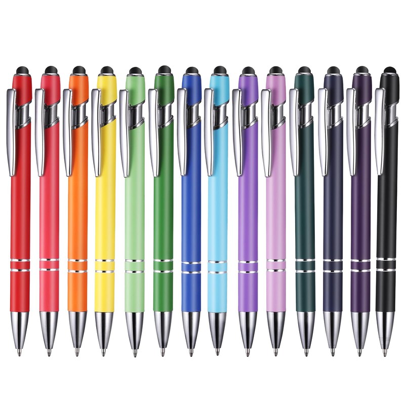 - Package: pack of 14 black ballpoint pens with touch pen, colourful metal pens 0.5 mm (14 colours) with black ink medium ballpoint pen. Ideal gift for party, teamwork, club, back to school, training etc.