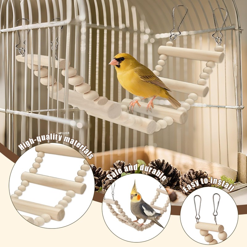 - Versatile toy set: the set contains nine different toys that provide variety in the bird cage accessories. Ladder, perch, cotton rope, swings and small chew toys offer birds a variety of possibilities for climbing, swinging and playing. So the everyday life of the animals remains interesting and active.