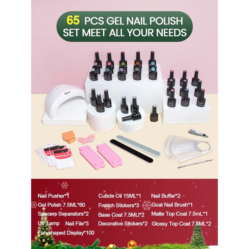 - Complete Gel Nail Kit with Premium Accessories - This all-in-one gel nail set includes 60 vibrant polish colors (7.5ml/bottle), 5 bottles essential function gels (base/top coats), a pro 24W/48W UV lamp, cuticle oil, nail stickers, and other manicure tools (file, clipper, pusher, etc.). Perfect for salon-quality DIY nails at home!
