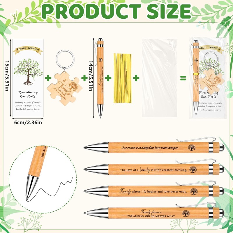 - Family Reunion Gifts--This Family Reunion Gifts Set includes 12 ballpoint pens with clips (4 styles, 3 pieces each), 12 wooden puzzle keychains, 12 family tree gifts cards, 12 OPP gifts bags, and a pack of 50 golden ribbons. Perfect for bulk family reunion favors, decorations, or meaningful tokens for family members