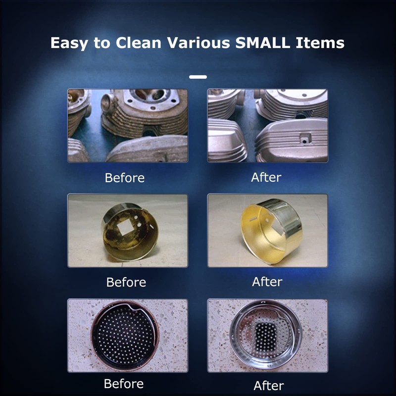 - Wide Range of Uses: This ultrasonic jewelry cleaner machine does a great job cleaning small or medium objects such as jewelry, watch parts, coins, glasses, fountain pen parts, 3D printed parts, bike chains, hardware parts etc.